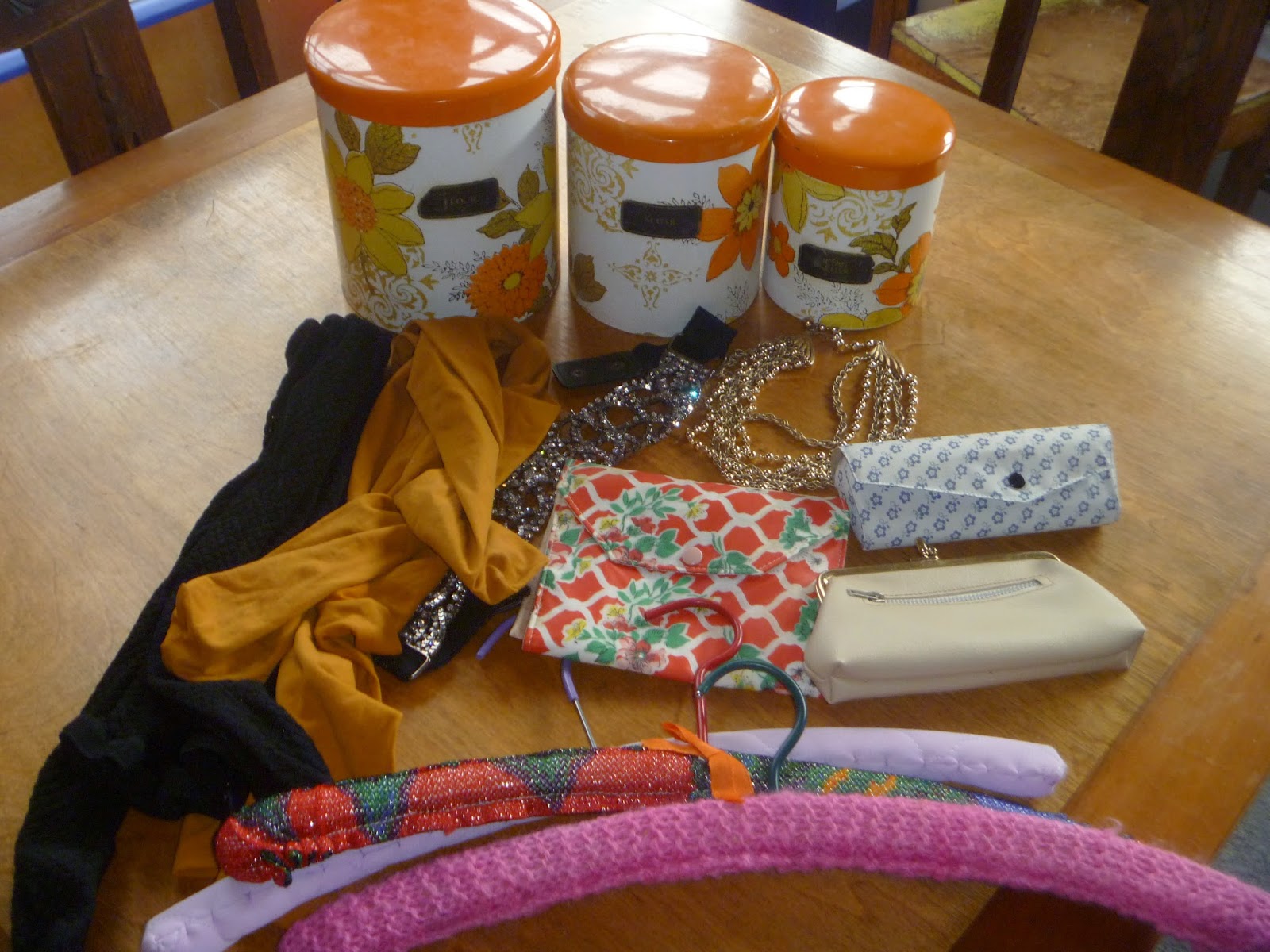 A divoon set of cannisters (I have more now than I can poke a stick at, as my Father used to say. Meaning A LOT), a couple of pairs of tights, a sweet sunglasses case, sewing kit and purse, a "gold" triple necklace, a glittery belt that I've turned into a headpiece, and some more groovy old hangers!
